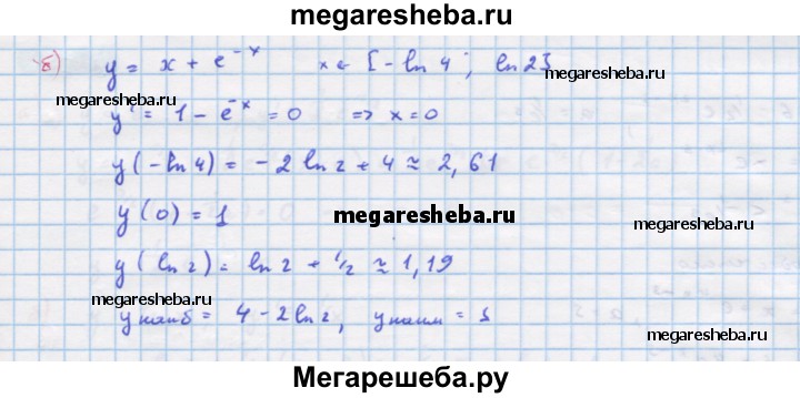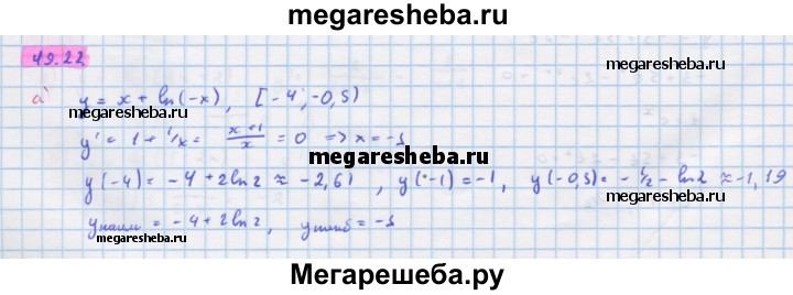 47.22. Найдите наименьшее и наибольшее значения заданной функции на заданном отрезке: а) у = х + In (-х), [-4, -0,5]; б) у = х + е-х, [-In 4, In 2].?