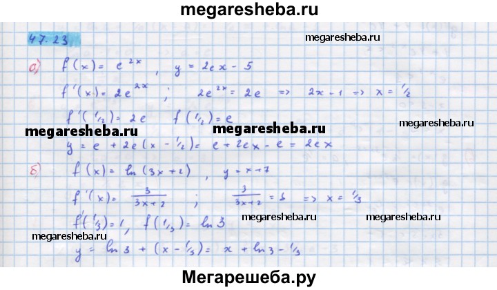 47.23. Напишите уравнение той касательной к графику функции y=f(x), которая параллельна данной прямой у = kx + m: а) f(x) = е2х, у = 2ех - 5; б) f(x) = In (3x + 2), у = х + 7.