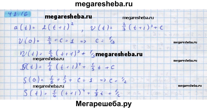 48.16. Ускорение движения точки по координатной прямой задано формулой a(t) = 2(t + 1)2, t — время движения. Найдите закон изменения скорости и = v(t) и закон движения s = s(t), если v(0) = 1, s(0) = 1.