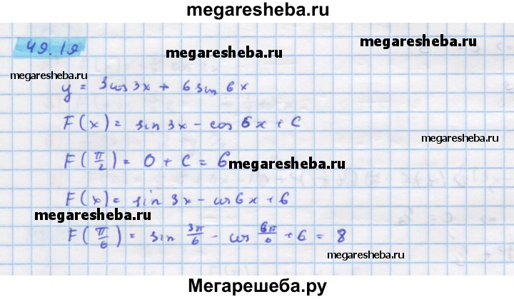 48.19. Некоторая первообразная функции у=3cos3x + 6sin6x принимает в точке х = π/2 значение 6. Какое значение принимает та же первообразная в точке х = π/6?