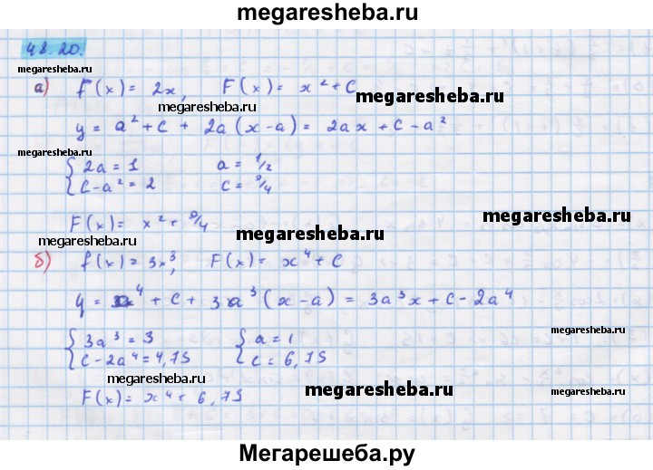 48.20. Найдите ту первообразную для заданной функции y=f(x), график которой касается заданной прямой y=kx + m: a) f(x) = 2х, у = х + 2; б) f(x) = Зх3, у = Зх + 4,75.