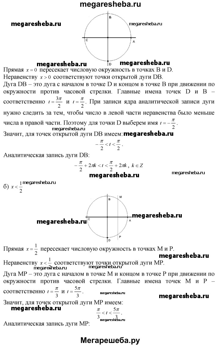 5.11. Найдите на числовой окружности точки с абсциссой или ординатой, удовлетворяющей заданному неравенству, и запишите (с помощью двойного неравенства), каким числам t они соответствуют: а) х > 0; б) х < 1/2; в) х > 1/2 г) х < 0.