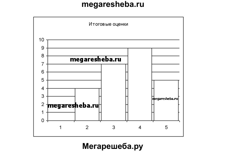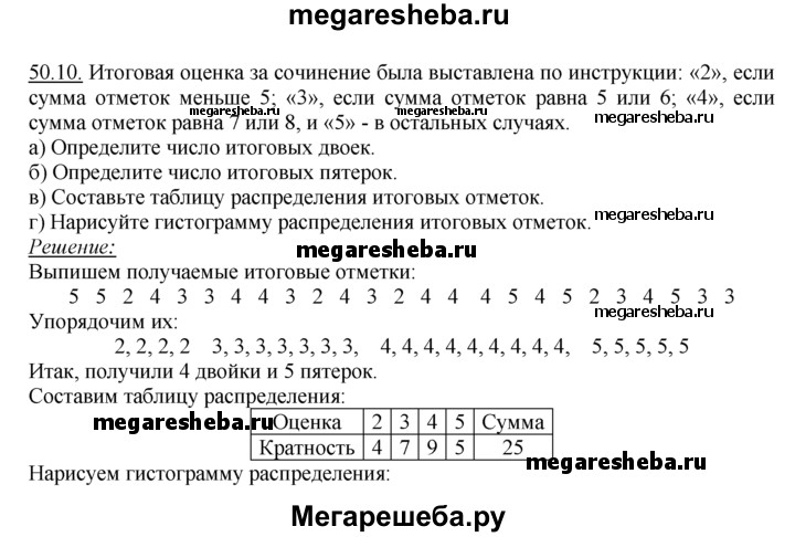 50.10. Итоговая отметка за сочинение была выставлена по инструкции: «2», если сумма отметок меньше 5; «3», если сумма отметок равна 5 или 6; «4», если сумма отметок равна 7 или 8, и «5» — в остальных случаях. а) Определите число итоговых двоек. б) Определите число итоговых пятерок. в) Составьте таблицу распределения итоговых отметок. г) Нарисуйте гистограмму распределения итоговых отметок.