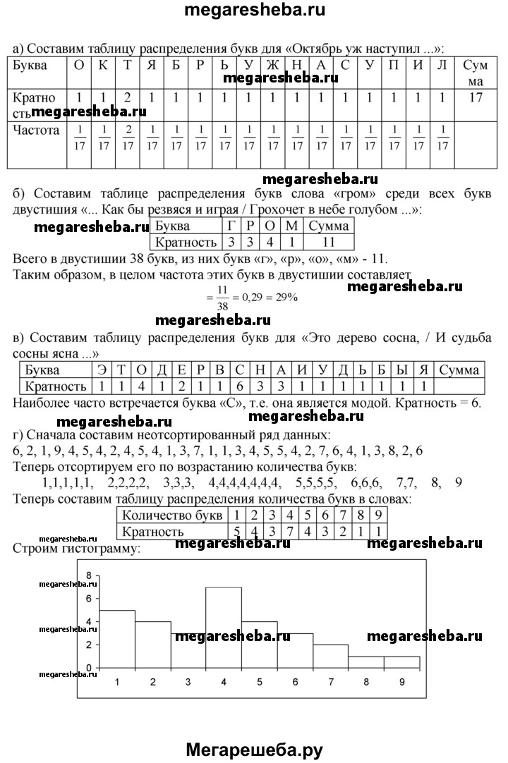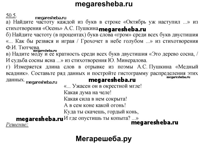 50.5 а) Найдите частоту каждой из букв в строке «Октябрь уж наступил...» из стихотворения «Осень» А. С. Пушкина. б) Найдите частоту (в процентах) букв слова «гром» среди всех букв двустишия «...Как бы резвяся и играя / Грохочет в небе голубом...» из стихотворения Ф. И. Тютчева. в) Найдите моду и ее кратность среди всех букв двустишия «Это дерево сосна, / И судьба сосны ясна...» из стихотворения Ю. Минералова. г) Измеряется длина слов в отрывке из поэмы А. С. Пушкина «Медный всадник». Составьте ряд данных и постройте гистограмму распределения этих данных. «...Ужасен он в окрестной мгле! Какая дума на челе! Какая сила в нем сокрыта! А в сем коне какой огонь! Куда ты скачешь, гордый конь, И где опустишь ты копыта?...»