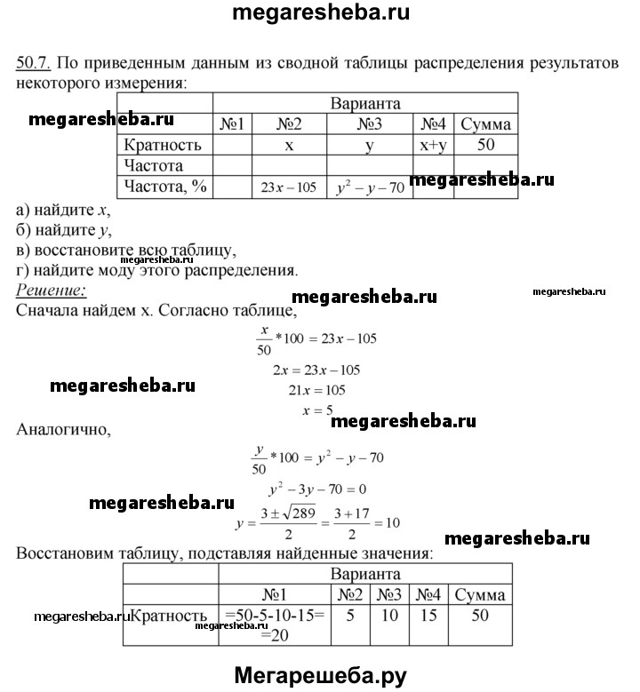 50.7. По приведенным данным из сводной таблицы распределения результатов некоторого измерения: а) найдите х; б) найдите у; в) восстановите всю таблицу; г) найдите моду этого распределения.