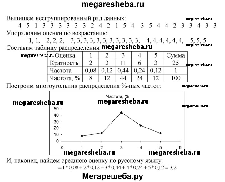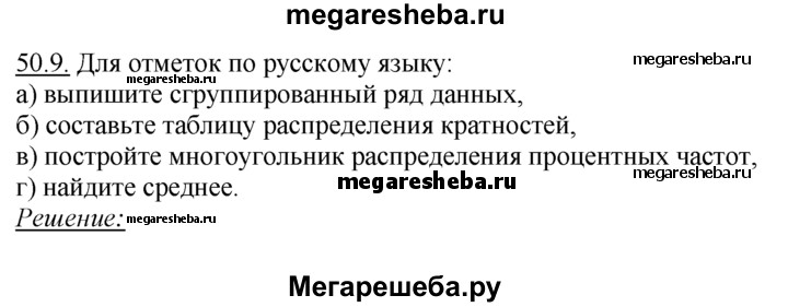 50.9. Для отметок по русскому языку: а) выпишите сгруппированный ряд данных; б) составьте таблицу распределения кратностей; в) постройте многоугольник распределения процентных частот; г) найдите среднее.
