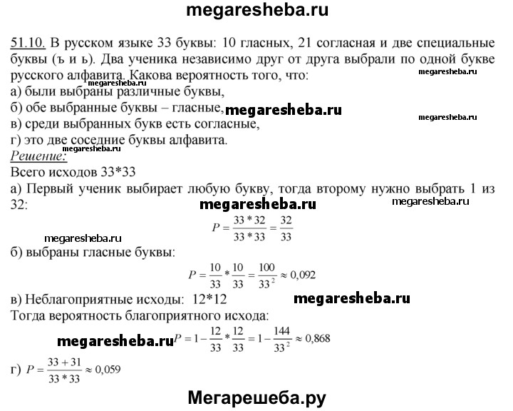 51.10. В русском языке 33 буквы: 10 гласных, 21 согласная и две специальные буквы (ъ и ь). Два ученика независимо друг от друга выбрали по одной букве русского алфавита. Какова вероятность того, что: а) были выбраны различные буквы; б) обе выбранные буквы — гласные; в) среди выбранных букв есть согласные; г) это две соседние буквы алфавита.