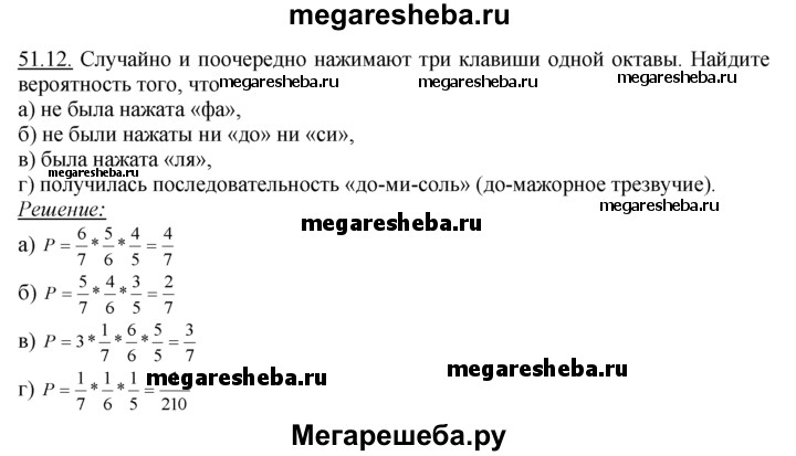51.12. Случайно и поочередно нажимают три клавиши одной октавы. Найдите вероятность того, что: а) не была нажата «фа»; б) не были нажаты ни «до», ни «си»; в) была нажата «ля»; г) получилась последовательность «до-ми-соль» (до- мажорное трезвучие).