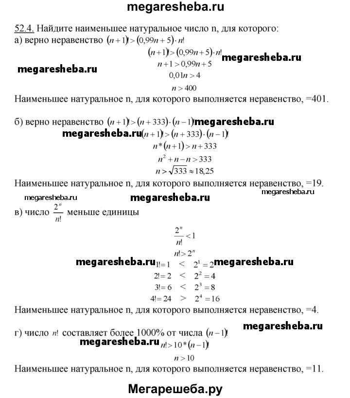 52.4. Найдите наименьшее натуральное число n, для которого: а) верно неравенство (n + 1)! > (0,99n + 5) * n! б) верно неравенство (n + 1)! > (n + 333) * (n - 1)! в) число 2n/n! меньше единицы; г) число n! составляет более 1000% от числа (n - 1)!