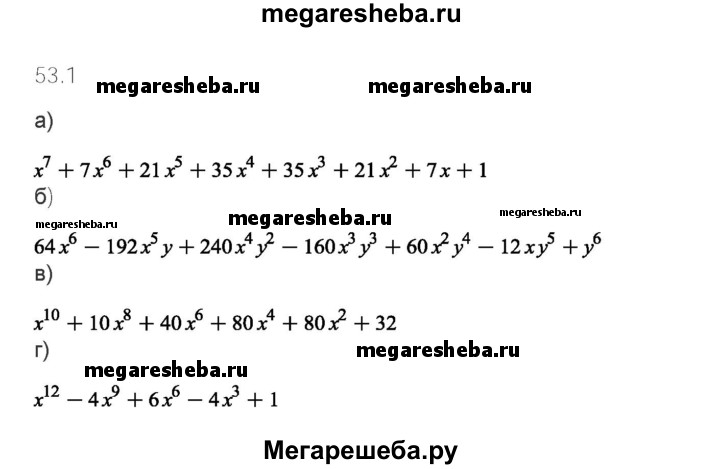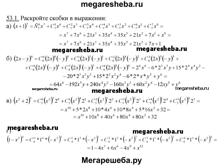 53.1. Раскройте скобки в выражении: а) (х + 1)7; б) (2х - у)6; в) (х2 + 2)5; г) (1 - х3)4.