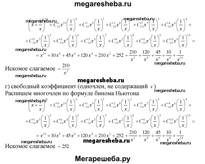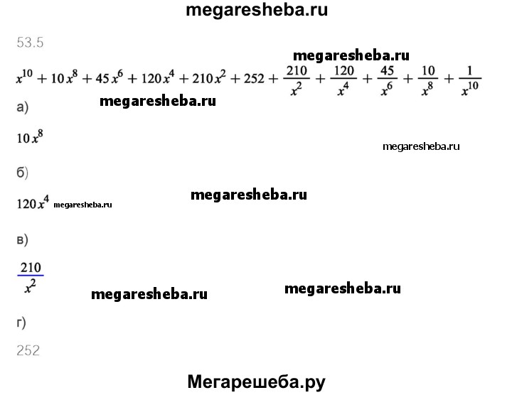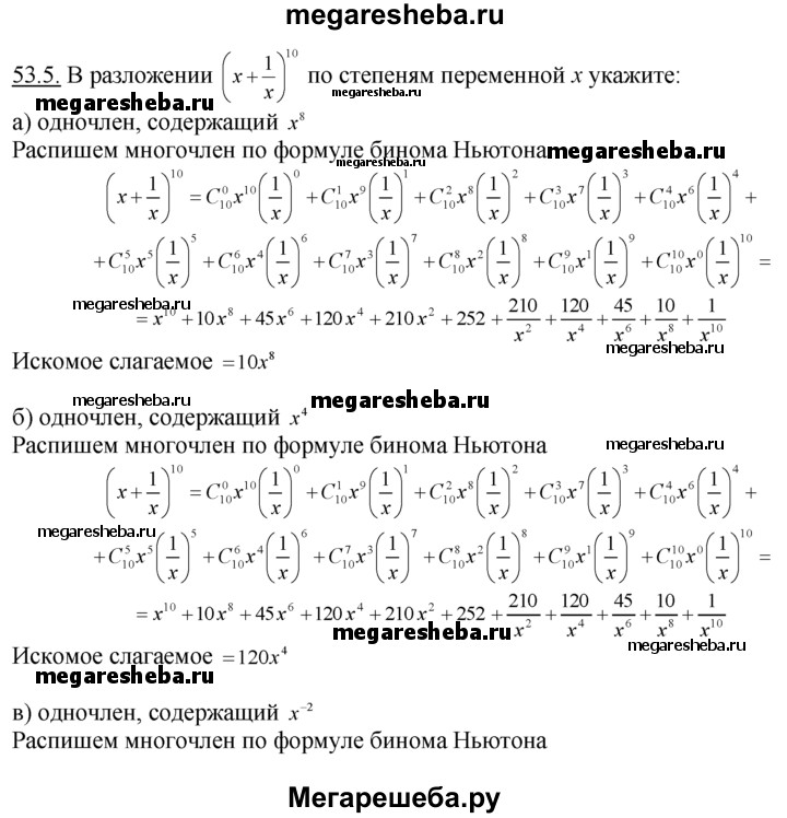 53.5. В разложении (х + 1/х)10 по степеням переменной х укажите: а) одночлен, содержащий х8; б) одночлен, содержащий х4; в) одночлен, содержащий х~2; г) свободный коэффициент (одночлен, не содержащий х).