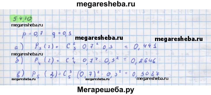 54.10. Пусть вероятность «успеха» в одном испытании Бернулли равна 0,7. Пользуясь теоремой Бернулли, составьте формулы для следующих событий: а) при трех независимых повторениях испытания будет ровно 2 «успеха»; б) при четырех независимых повторениях испытания будет ровно 2 «неудачи»; в) при пяти независимых повторениях испытания будет ровно 3 «успеха». Вычислите вероятности в а) — в).