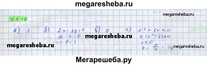 54.12. Случайным образом выбирают одно из решений неравенства х2 ≤ 9. Найдите вероятность того, что оно является решением неравенства: а) x2 ≤ 10; б) 2х - 3 ≤ 17; в) х2 ≥ 10; г) х3+2х ≥ 0.