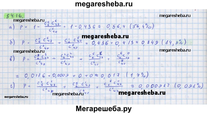 54.16. (Продолжение задачи 54.4.) Карточка лотереи «Спортлото» содержит 49 чисел. В итоге тиража выигрывают какие-то 6 чисел. Какова (в процентах) вероятность того, что на вашей карточке, где отмечены 6 чисел, верно угадано: а) хотя бы одно число; б) не более одного числа; в) не менее трех чисел; г) 4, 5 или 6 чисел?