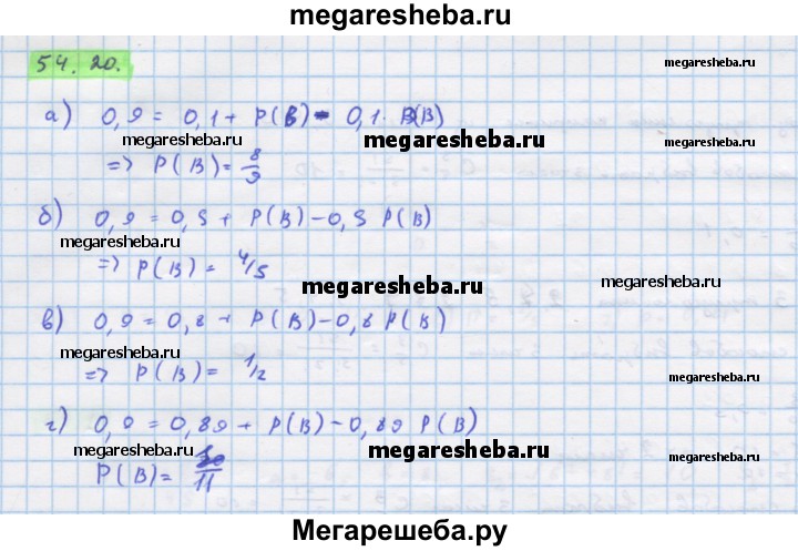 54.20. Вероятность Р(А + В) суммы двух независимых событий А и В равна 0,9. Найдите, чему равна вероятность Р(В) события В, если известно, что вероятность Р(А) события А равна: а) 0,1; б) 0,5; в) 0,8; г) 0,89.