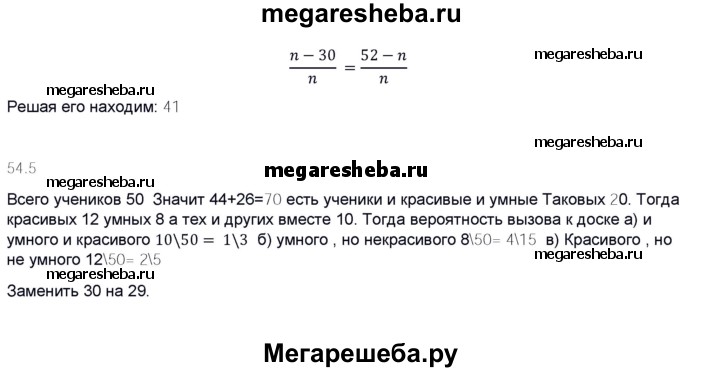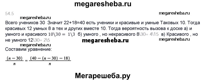 54.5. В классе 22 красивых ученика, а умных — 18. Всего в классе 30 учеников, и каждый из них умный или красивый. Какова вероятность того, что случайно вызванный по списку класса ученик: а) и умный, и красивый; б) умный, но не красивый; в) красивый, но не умный. Измените в условии общее количество учеников так, чтобы ответы в пунктах а) и в) были одинаковыми.