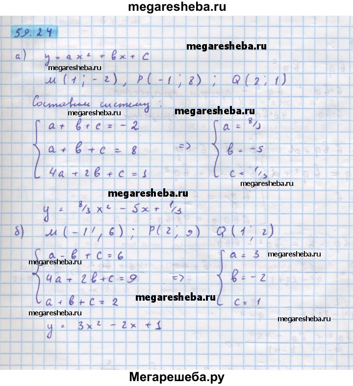 59.24. Составьте уравнение параболы у = аx2 + bx + с, если известно, что она проходит через точки М, Р, Q: а) М( 1; -2), Р(-1; 8), Q(2; -1); б) М(-1; 6), Р(2; 9), Q(l; 2).