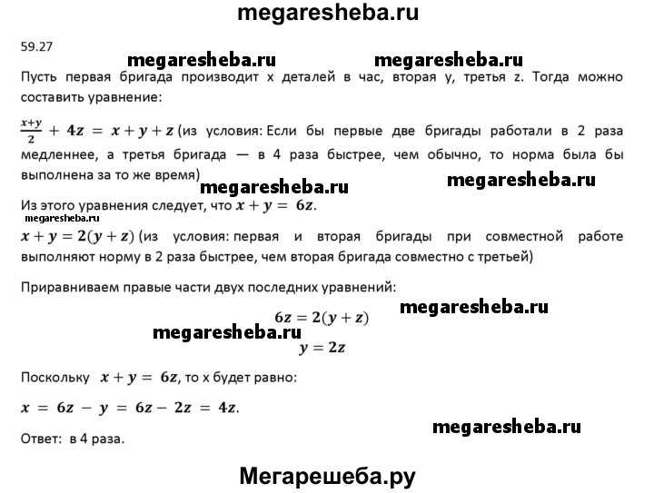 59.27. Три бригады, работая вместе, выполняют норму по изготовлению подшипников за некоторое время. Если бы первые две бригады работали в 2 раза медленнее, а третья бригада — в 4 раза быстрее, чем обычно, то норма была бы выполнена за то же время. Известно, что первая и вторая бригады при совместной работе выполняют норму в 2 раза быстрее, чем вторая бригада совместно с третьей. Во сколько раз первая бригада производит подшипников за 1 ч больше, чем третья?