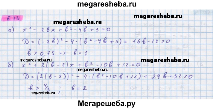 60.13. Найдите наименьшее целочисленное значение параметра b, при котором уравнение имеет два корня: а) х2 – 2bх + b2 – 4b + 3 = 0; б) х2 + 2(b - 2)х + b2 – 10b + 12 = 0.
