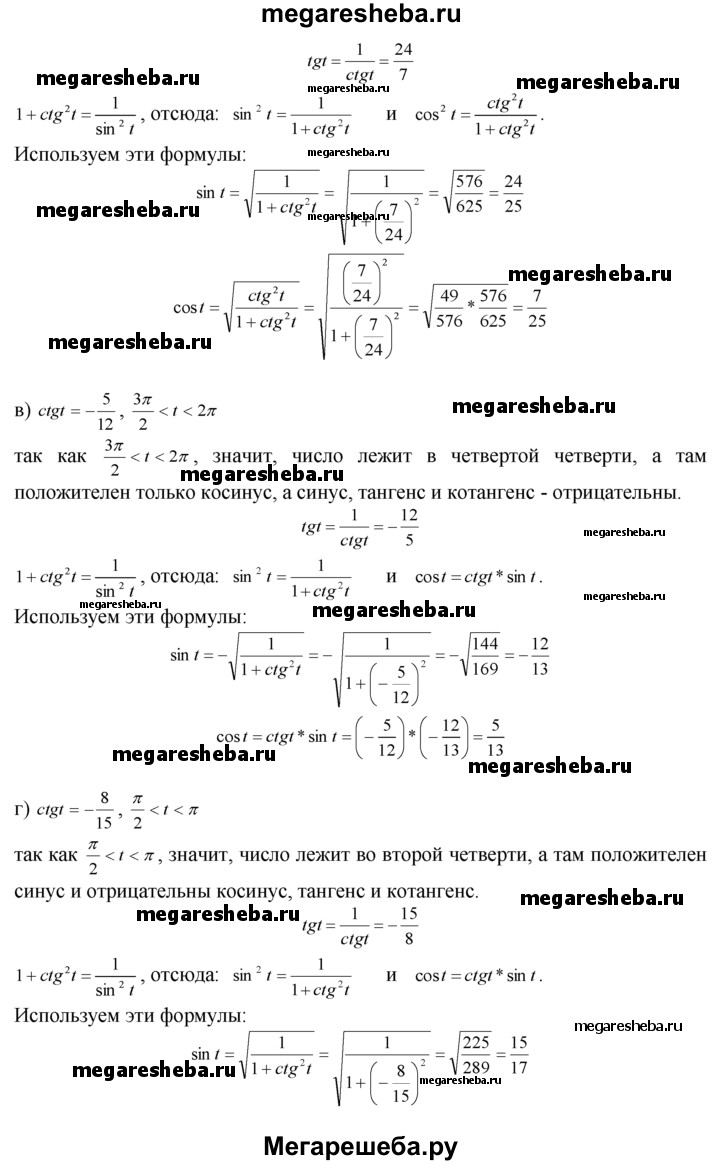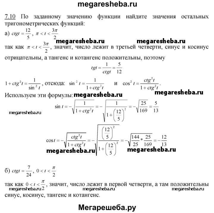 7.10. По заданному значению функции найдите значения остальных тригонометрических функций: а) ctg t = 12/5, π < t < 3π/2; б) ctg t = 7/24, 0 < t < π/2; в) ctg t = -5/12, 3π/2 < t < 2π; г) ctg t = -8/15, π/2 < t < π.