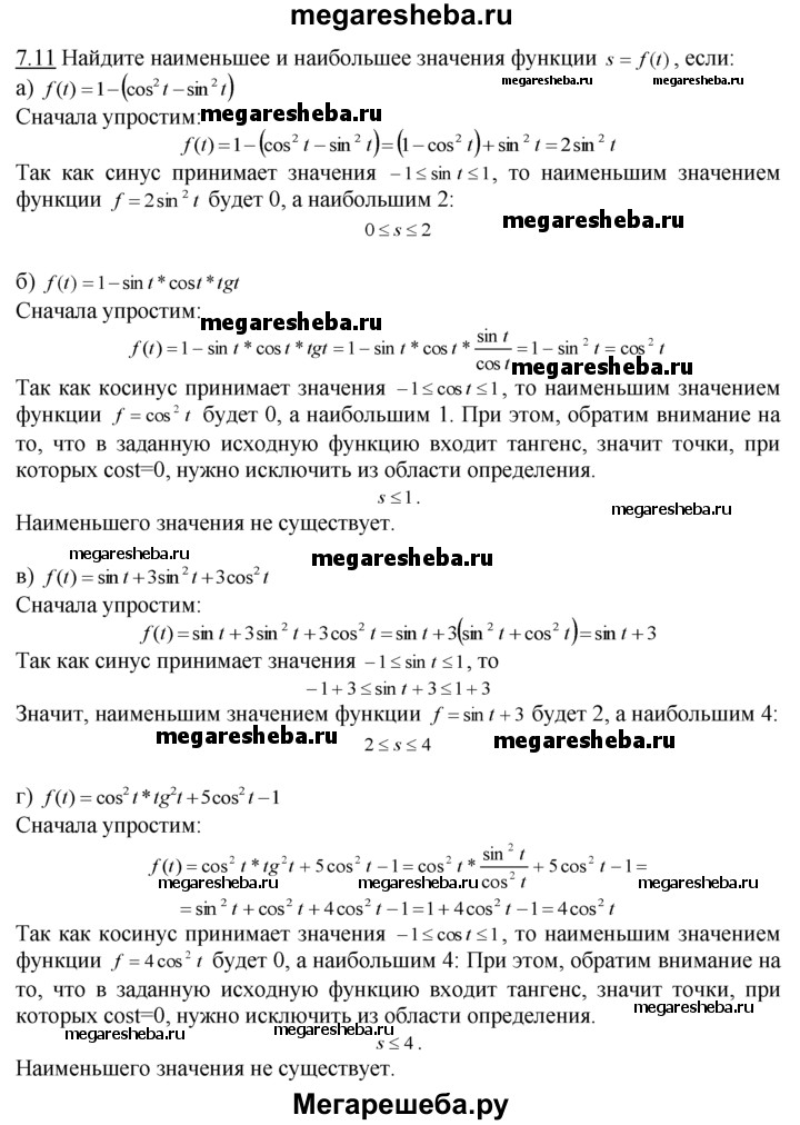 7.11. Найдите наименьшее и наибольшее значения функции s = f(t), если: а) f(t) = 1 - (cos2 t - sin2 t); б) f(t) = 1 - sin t * cos t * tg t; в) f(t) = sin t + 3 sin2 t + 3 cos2 t; г) f(t) = cos2 t * tg2 t + 5 cos2 t - 1.