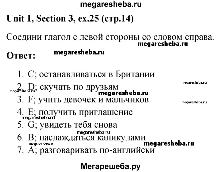 Подробный решебник (ГДЗ) по Английскому языку за 5‐6 (пятый‐шестой) класс - готовый ответ unit 1 1-4 section - 25. Авторы учебника: Биболетова, Денисенко, Трубанева. Издательство: Титул 2015.
