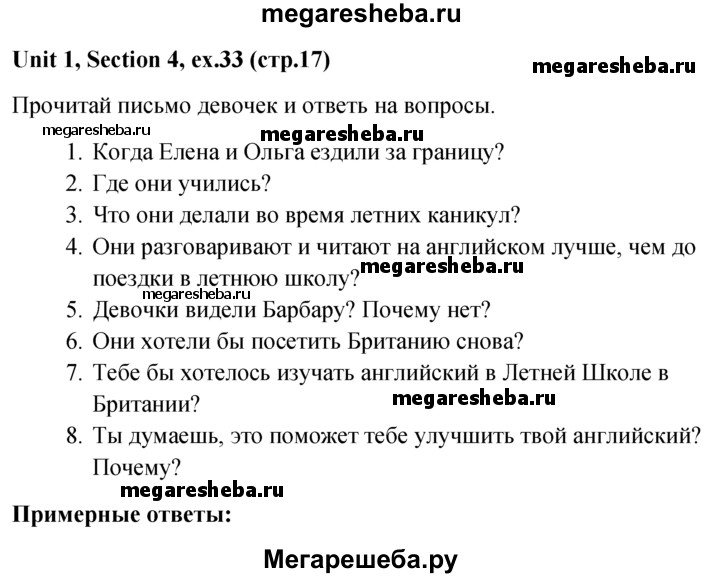 Подробный решебник (ГДЗ) по Английскому языку за 5‐6 (пятый‐шестой) класс - готовый ответ unit 1 1-4 section - 33. Авторы учебника: Биболетова, Денисенко, Трубанева. Издательство: Титул 2015.