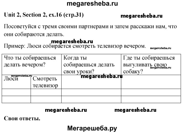 Подробный решебник (ГДЗ) по Английскому языку за 5‐6 (пятый‐шестой) класс - готовый ответ unit 2 1-3 section - 16. Авторы учебника: Биболетова, Денисенко, Трубанева. Издательство: Титул 2015.