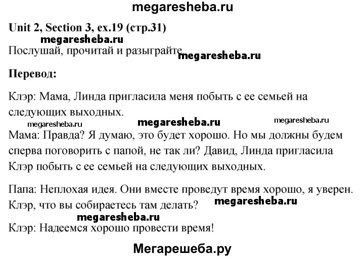 Подробный решебник (ГДЗ) по Английскому языку за 5‐6 (пятый‐шестой) класс - готовый ответ unit 2 1-3 section - 19. Авторы учебника: Биболетова, Денисенко, Трубанева. Издательство: Титул 2015.