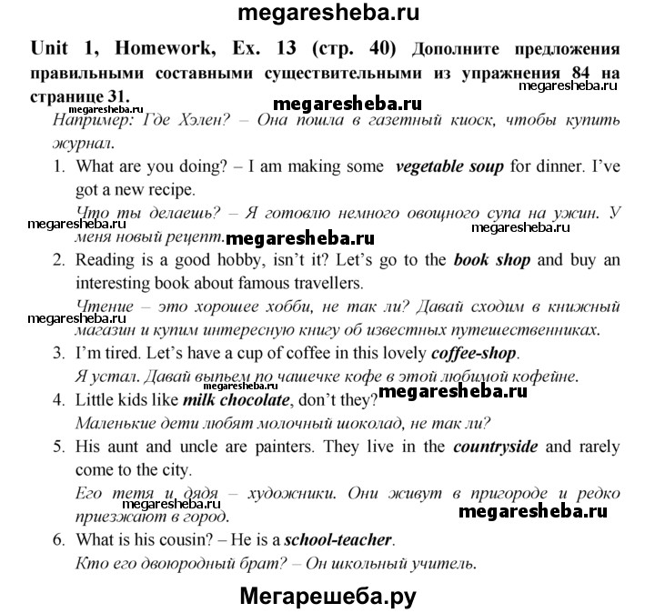 Подробный решебник (ГДЗ) по Английскому языку за 6 (шестой) класс Enjoy English - готовый ответ unit 1 homework - 13. Авторы учебника: Биболетова, Денисенко, Трубанева. Издательство: Титул 2015-2023.