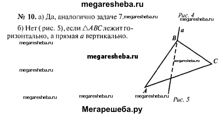 10. Верно ли, что прямая лежит в плоскости данного треугольника, если она: а) пересекает две стороны треугольника; б) проходит через одну из вершин треугольника?