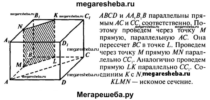114. Изобразите параллелепипед ABCDA₁B₁C₁D₁ и отметьте на ребре АВ точку М. Постройте сечение параллелепипеда плоскостью, проходящей через точку М параллельно плоскости АСС₁.
