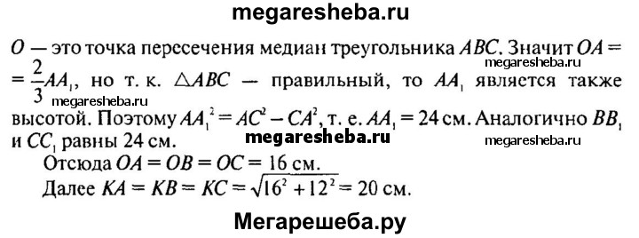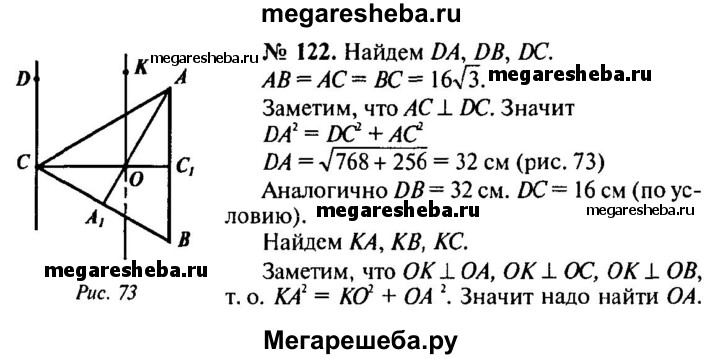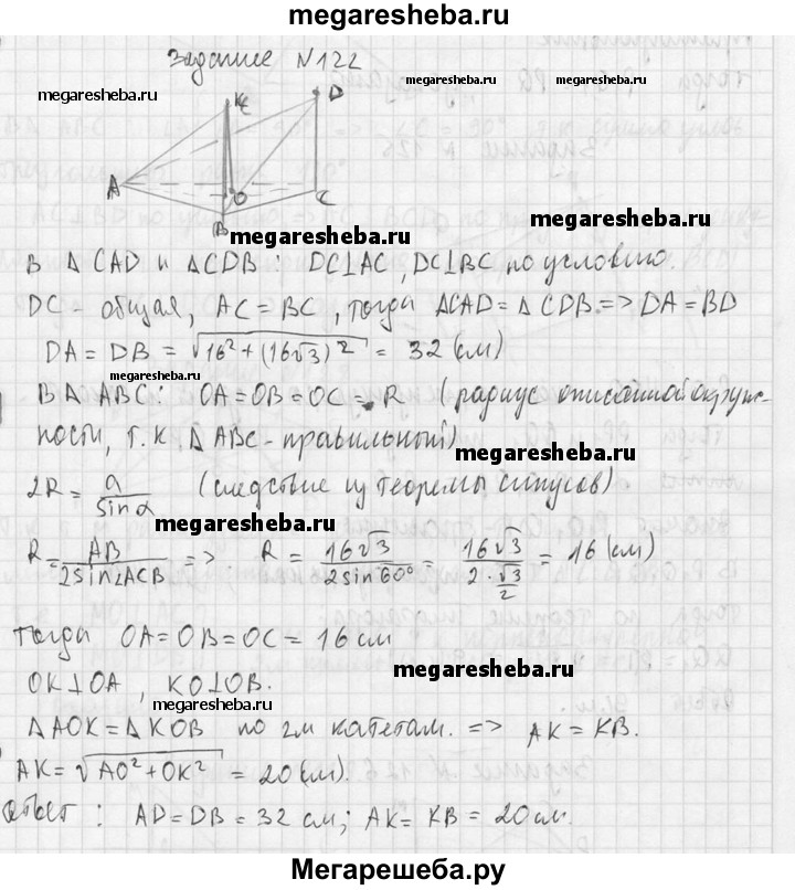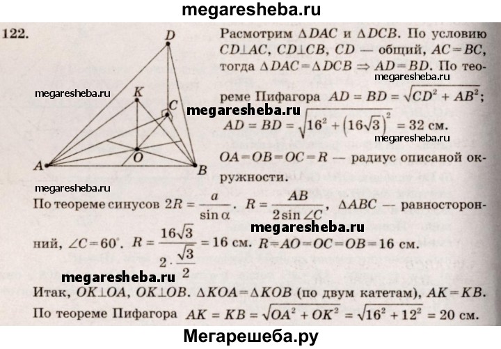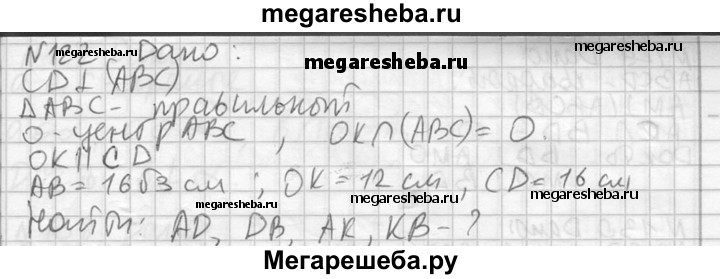 122. Прямая CD перпендикулярна к плоскости правильного треугольника ABC. Через центр О этого треугольника проведена прямая ОК, параллельная прямой CD. Известно, что АВ 16√3 см, ОК = 12 см, CD = 16 см. Найдите расстояния от точек D и К до вершин А и В треугольника.