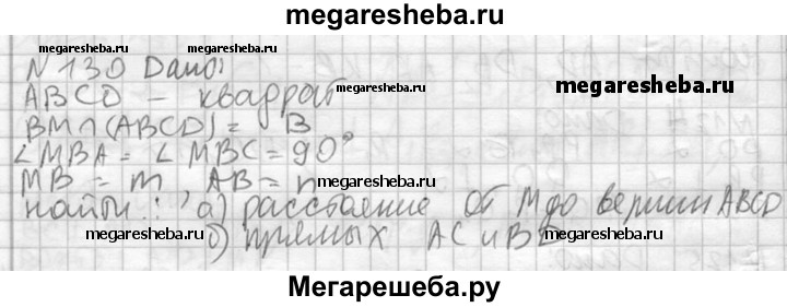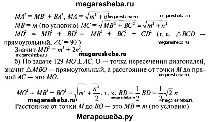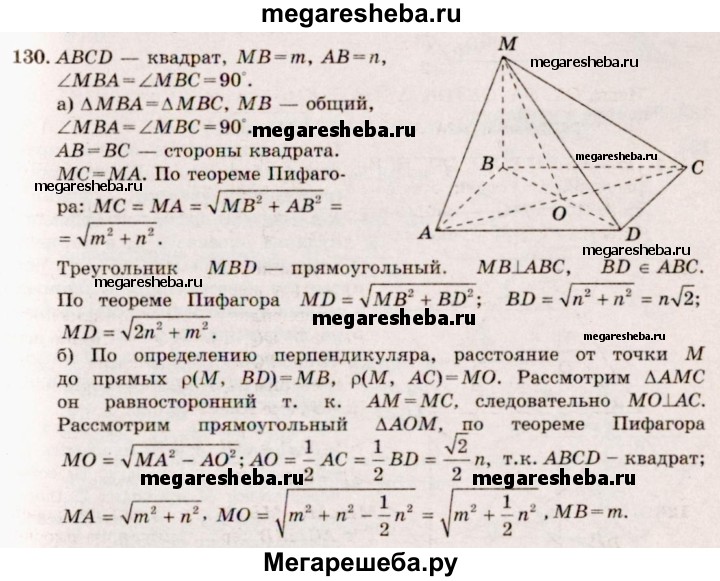 130. Через вершину B квадрата ABCD проведена прямая ВМ. Известно, что угол MBA = углу MBC = 90°; MB = m, АВ =n. Найдите расстояния от точки М до: а) вершин квадрата; б) прямых АС и BD.