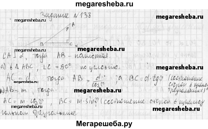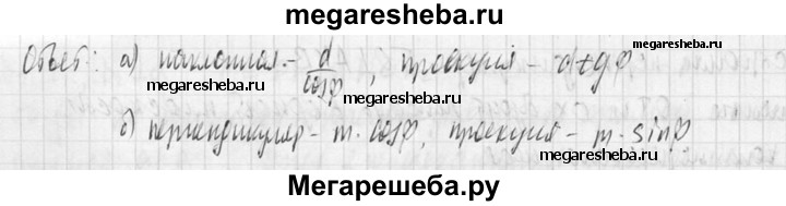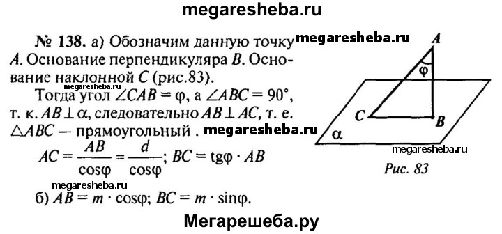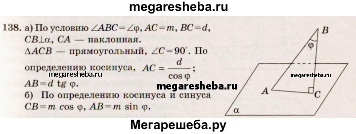 138. Из некоторой точки проведены к данной плоскости перпендикуляр и наклонная, угол между которыми равен ф. а) Найдите наклонную и ее проекцию на данную плоскость, если перпендикуляр равен d. б) Найдите перпендикуляр и проекцию наклонной, если наклонная равна m.