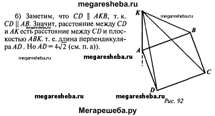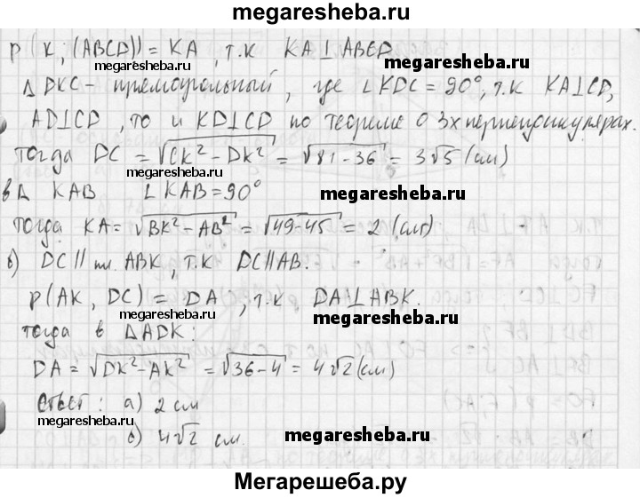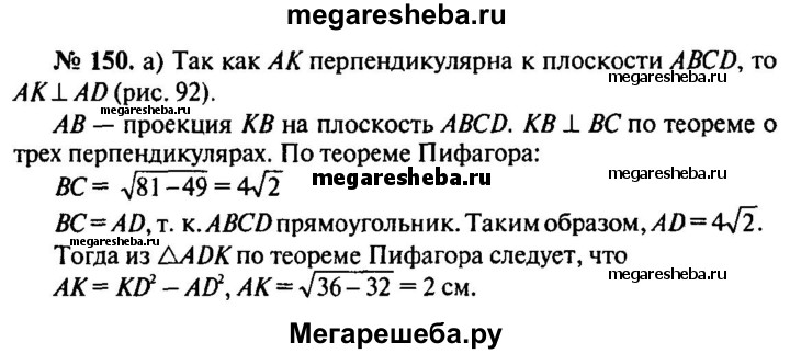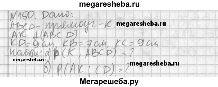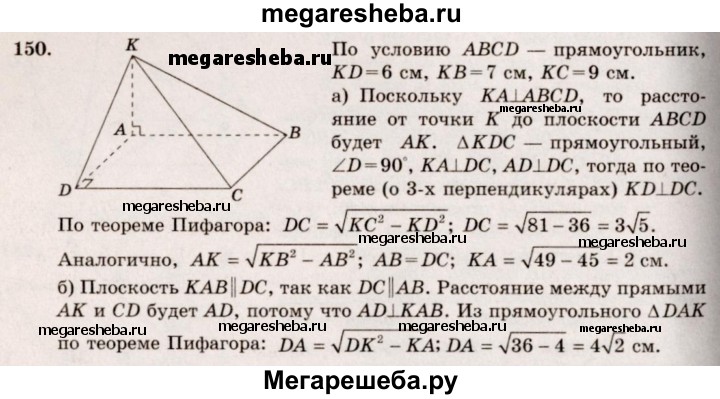 150. Через вершину А прямоугольника ABCD проведена прямая АК, перпендикулярная к плоскости прямоугольника. Известно, что KD = 6 см, KB = 7 см, КС = 9 см. Найдите: а) расстояние от точки К до плоскости прямоугольника ABCD; б) расстояние между прямыми АК и CD.
