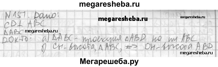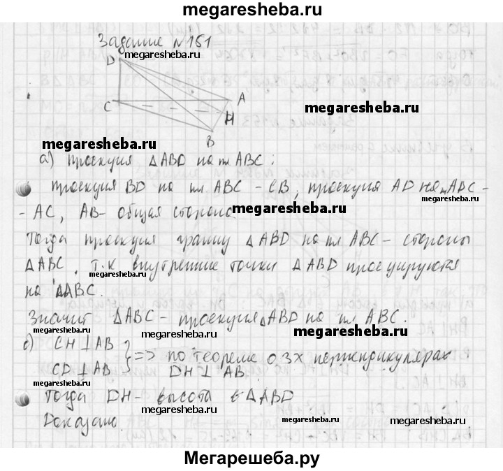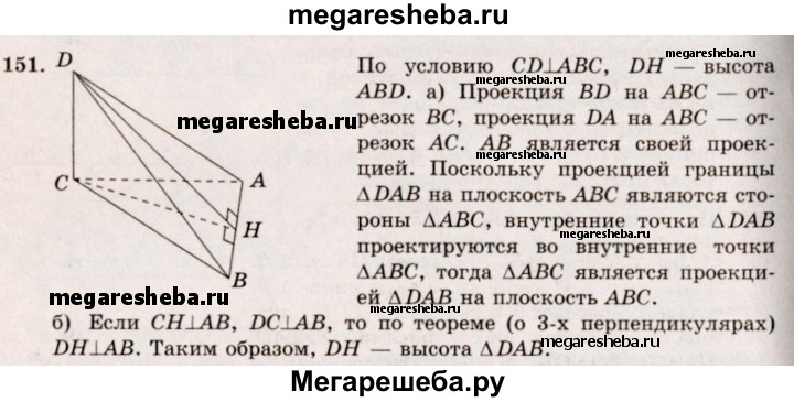 151. Прямая CD перпендикулярна к плоскости треугольника ABC. Докажите, что: а) треугольник ABC является проекцией треугольника ABD на плоскость ABC; б) если СН — высота треугольника ABC, то DH — высота треугольника ABD.