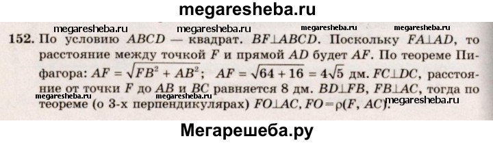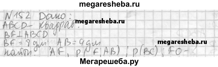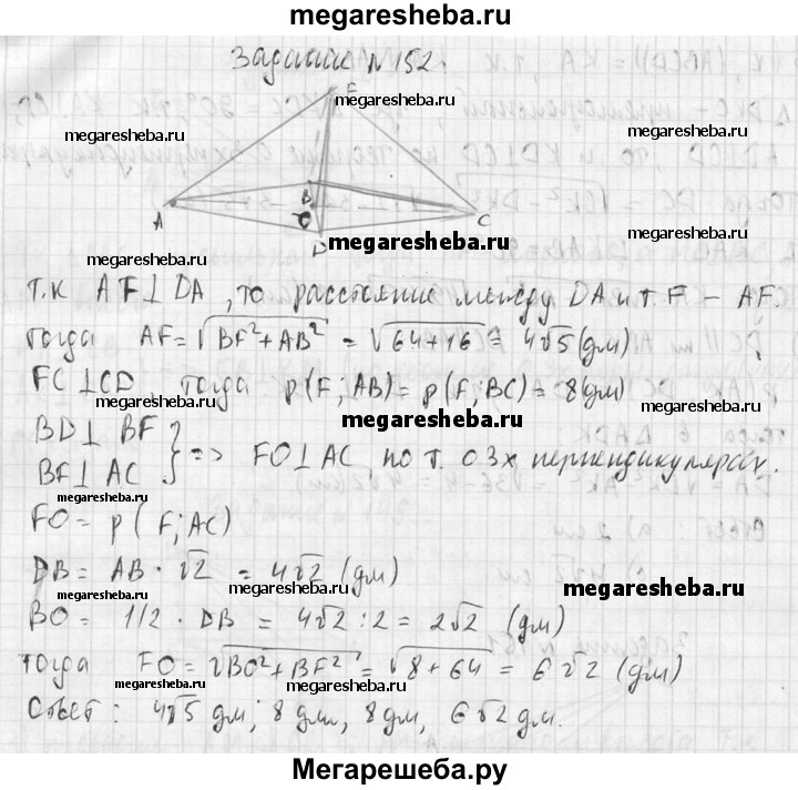 152. Через вершину В квадрата ABCD проведена прямая BF, перпендикулярная к его плоскости. Найдите расстояния от точки F до прямых, содержащих стороны и диагонали квадрата, если BF = 8 дм, АВ = 4 дм.