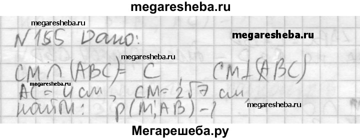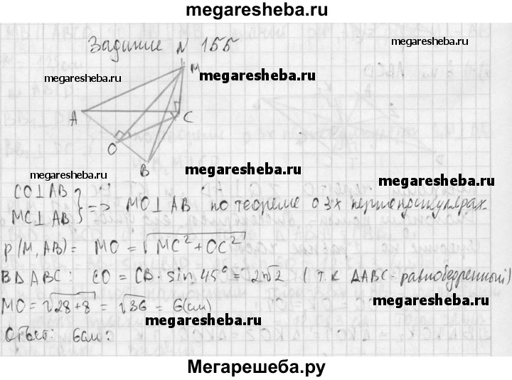 155. Через вершину прямого угла С равнобедренного прямоугольного треугольника ABC проведена прямая СМ, перпендикулярная к его плоскости. Найдите расстояние от точки М до прямой АВ, если АС = 4 см, а СМ = 2√7 см.