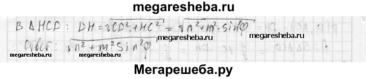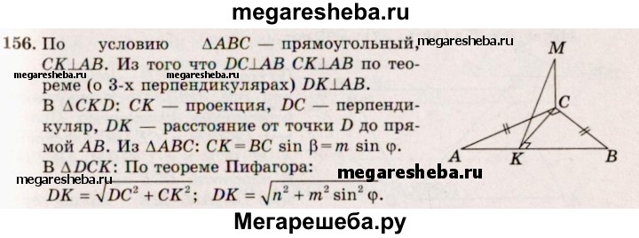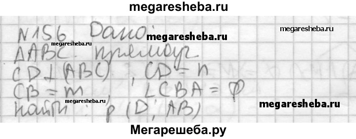 156. Один из катетов прямоугольного треугольника ABC равен m, а острый угол, прилежащий к этому катету, равен φ. Через вершину прямого угла С проведена прямая CD, перпендикулярная к плоскости этого треугольника, CD = n. Найдите расстояние от точки D до прямой АВ.