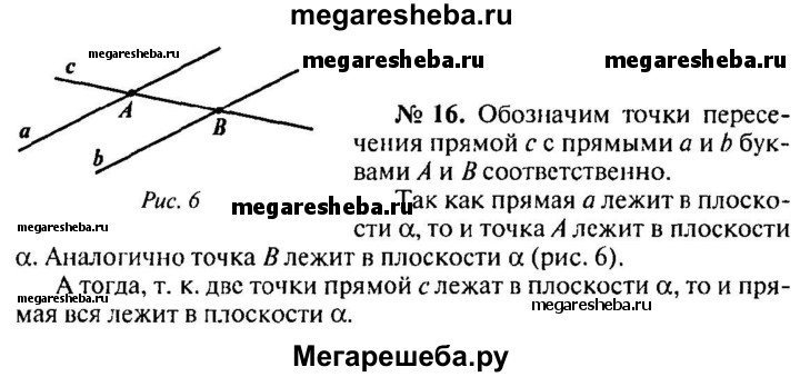 16. Параллельные прямые а и b лежат в плоскости α. Докажите, что прямая с, пересекающая прямые а и b, также лежит в плоскости α.