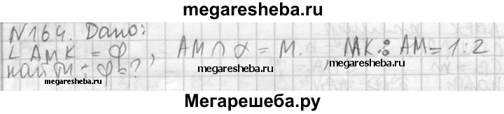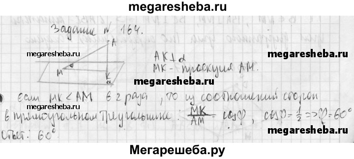 164. Под углом ф к плоскости α проведена наклонная. Найдите ф, если известно, что проекция наклонной вдвое меньше самой наклонной.