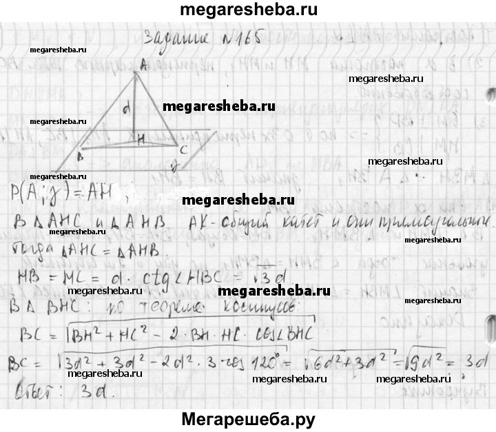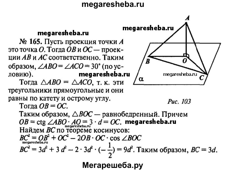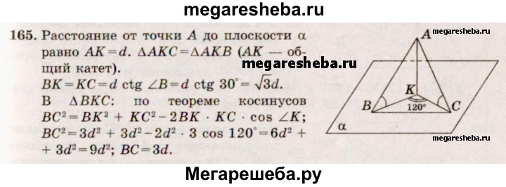 165. Из точки А, удаленной от плоскости у на расстояние d, проведены к этой плоскости наклонные АВ и АС под углом 30° к плоскости. Их проекции на плоскость у образуют угол в 120°. Найдите ВС.