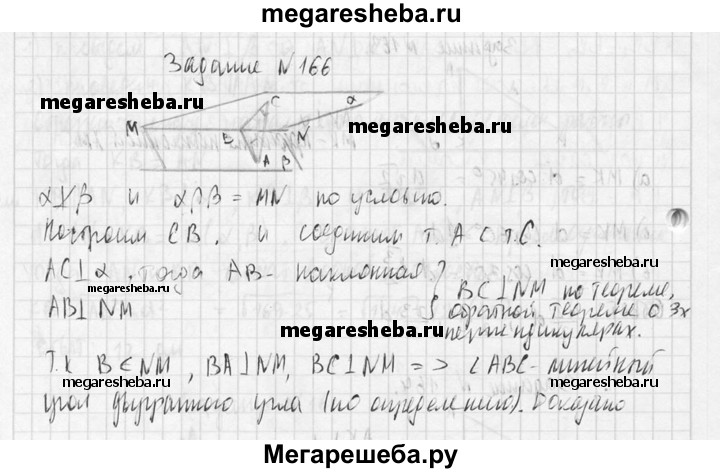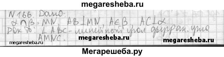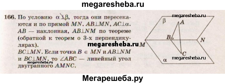 166. Неперпендикулярные плоскости α и β пересекаются по прямой MN. В плоскости β из точки А проведен перпендикуляр АВ к прямой MN и из той же точки А проведен перпендикуляр АС к плоскости α. Докажите, что угол ABC — линейный угол двугранного угла AMNC.