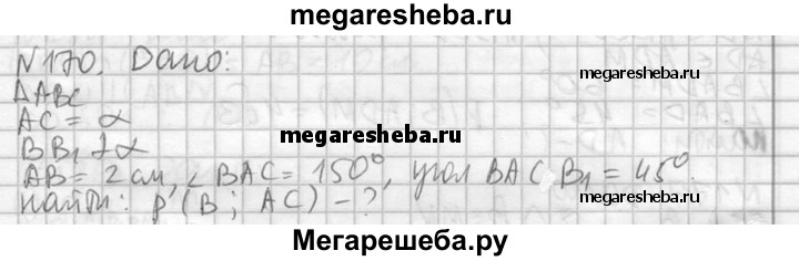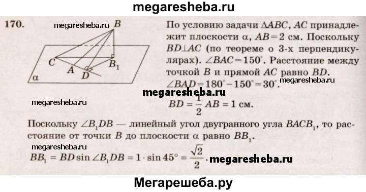 170. Из вершины В треугольника ABC, сторона АС которого лежит в плоскости α, проведен к этой плоскости перпендикуляр ВВ₁. Найдите расстояния от точки В до прямой АС и до плоскости α, если АВ = 2 см, угол BAC = 150° и двугранный угол BACB₁ равен 45°.