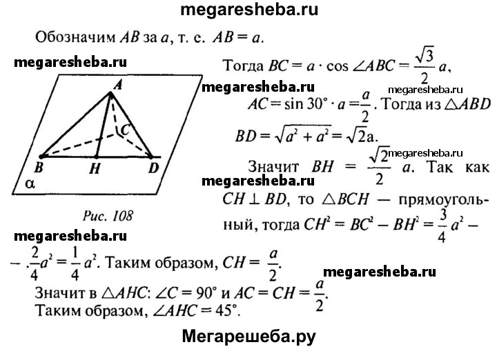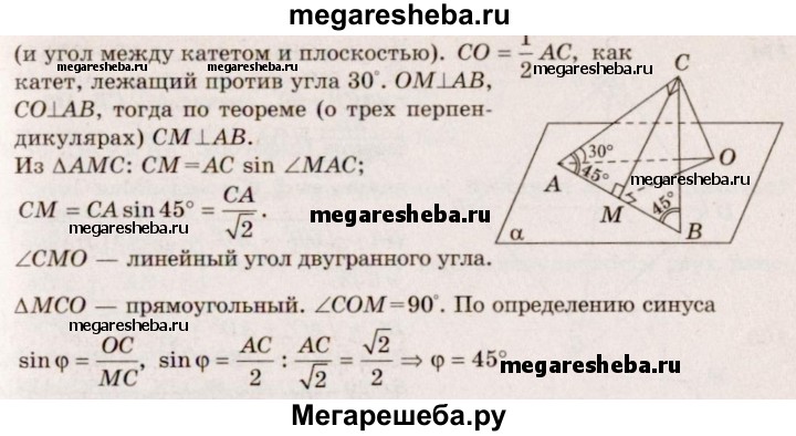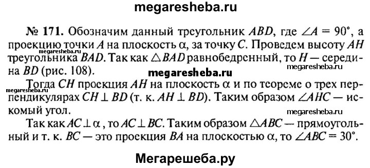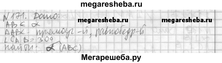 171. Гипотенуза прямоугольного равнобедренного треугольника лежит в плоскости α, а катет наклонен к этой плоскости под углом 30°. Найдите угол между плоскостью а и плоскостью треугольника.