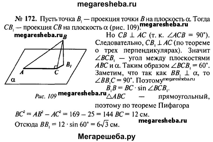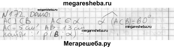 172. Катет АС прямоугольного треугольника ABC с прямым углом С лежит в плоскости α, а угол между плоскостями α и ABC равен 60°. Найдите расстояние от точки В до плоскости α, если АС = 5 см, АВ = 13 см.