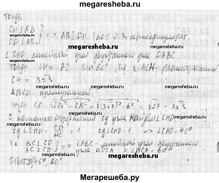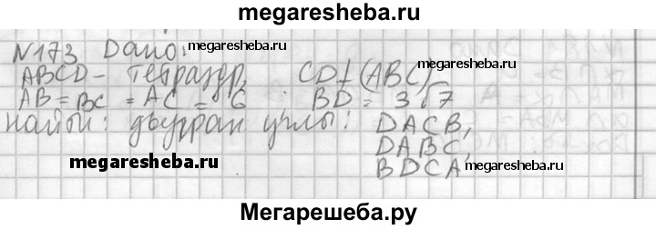173. Ребро CD тетраэдра ABCD перпендикулярно к плоскости ABC, АВ = ВС=АС = 6, BD = З√7. Найдите двугранные углы DACB, DABC, BDCA.