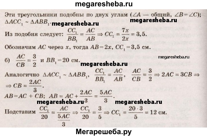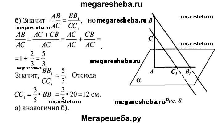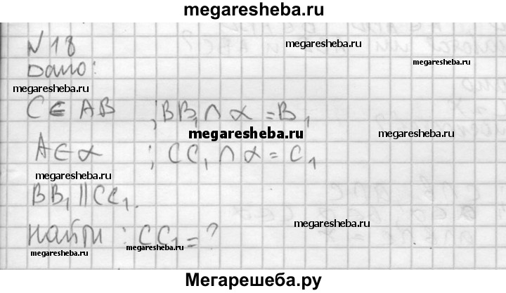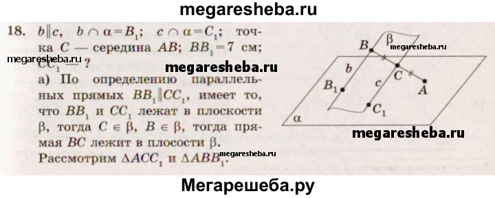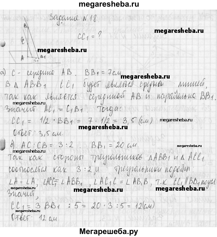 18. Точка С лежит на отрезке АВ. Через точку А проведена плоскость, а через точки В и С — параллельные прямые, пересекающие эту плоскость соответственно в точках В₁ и С₁. Найдите длину отрезка СС₁, если: а) точка С — середина отрезка АВ и ВВ₁ = 7 см; б) АС : СВ = 3 : 2 и ВВ₁ = 20 см.