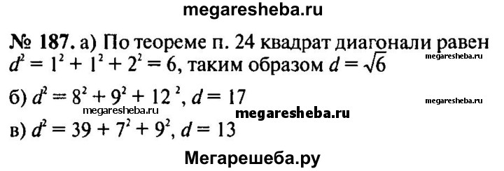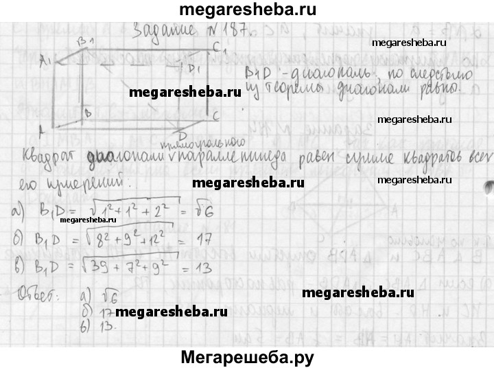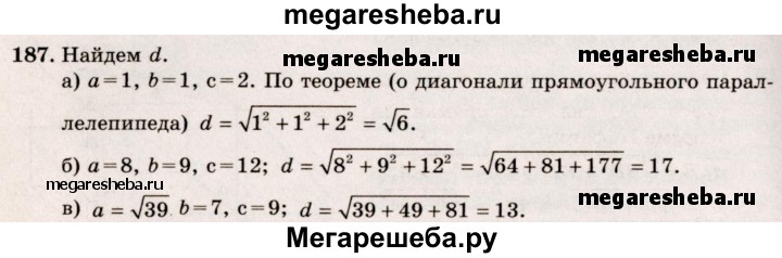 187. Найдите диагональ прямоугольного параллелепипеда, если его измерения равны: а) 1, 1, 2; б) 8, 9, 12; в) √39, 7, 9.